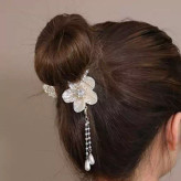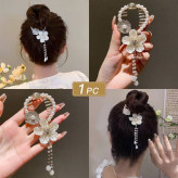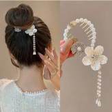 گیرهی مرواریدی با ترکیب گلهای ظریف، مرواریدهای آویزان و زنجیرهای طلایی، انتخابی شیک برای استایلهای رسمی. مناسب برای مراسم عقد، تولد، عکاسی و شینیونهای رمانتیک. سبک، بدون فشار روی مو و با ثبات بالا در فرمدهی.
