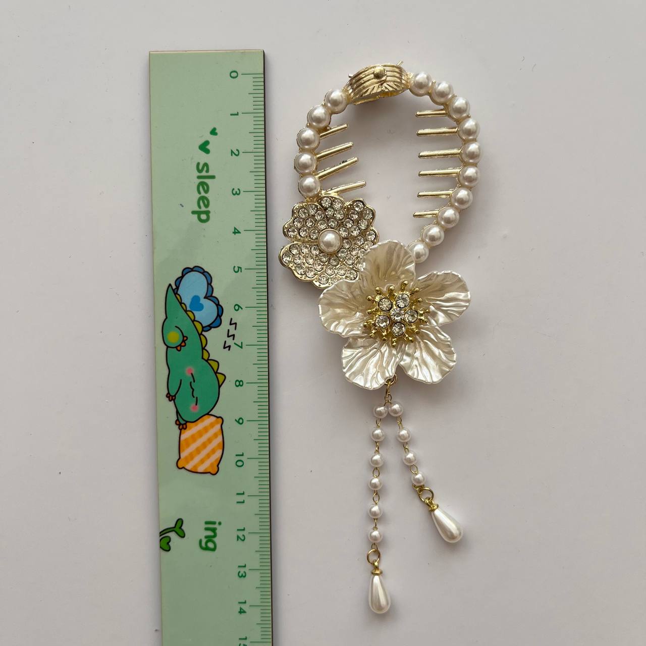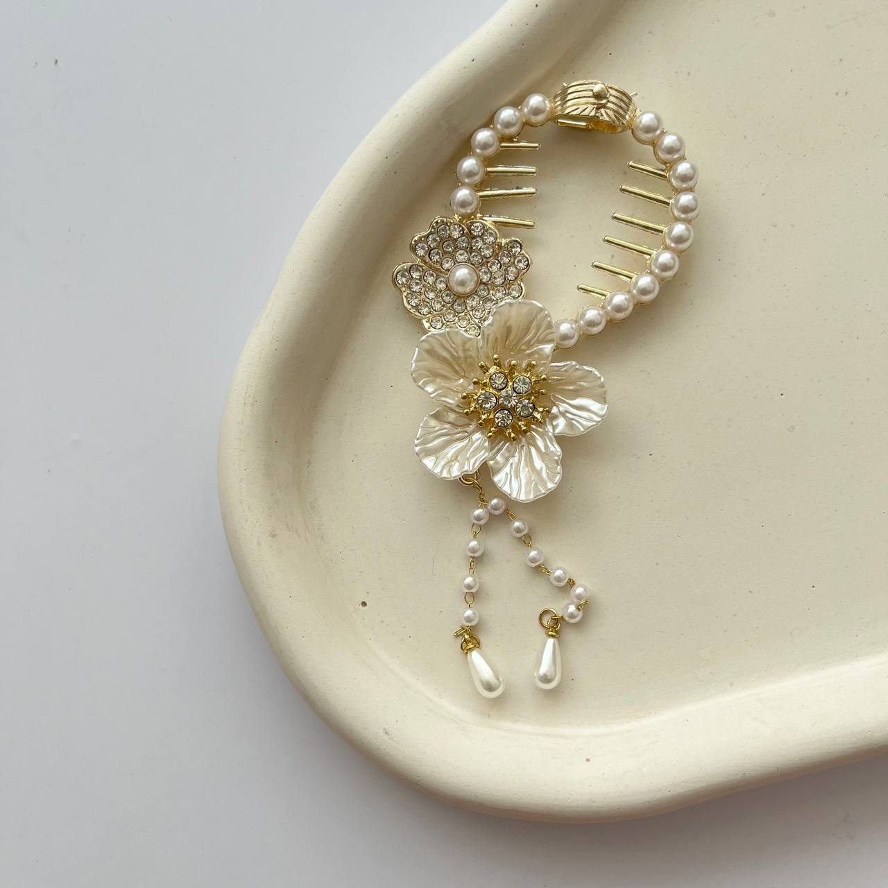 گیرهی مرواریدی با ترکیب گلهای ظریف، مرواریدهای آویزان و زنجیرهای طلایی، انتخابی شیک برای استایلهای رسمی. مناسب برای مراسم عقد، تولد، عکاسی و شینیونهای رمانتیک. سبک، بدون فشار روی مو و با ثبات بالا در فرمدهی.